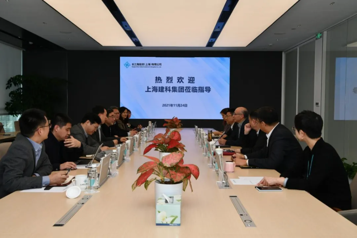 11月24日下午,上海建科集团党委书记、董事长王吉杰,党委副书记、总裁朱雷一行到访太阳成集团tyc122cc,与公司党委书记、董事长池洪,党委副书记、总裁桂恩亮,副总裁卢薪开展交流。