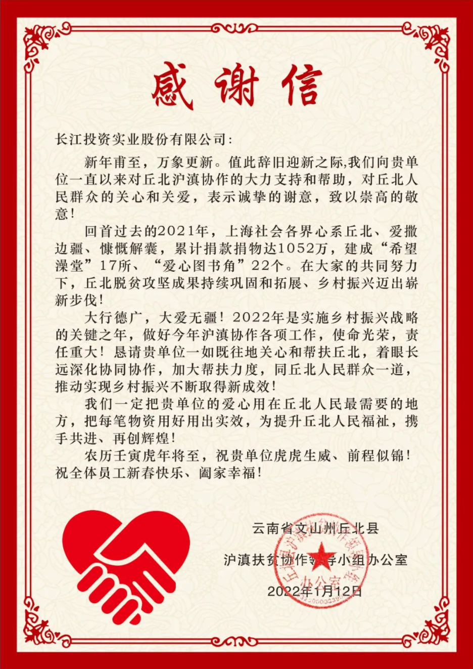 近日,长江投资实业股份有限公司收到一封来自云南省文山州丘北县扶贫办的感谢信,来信通过真挚的言语表达对长江投资近年来心系丘北、以实际行动帮扶关爱丘北的感谢之情。