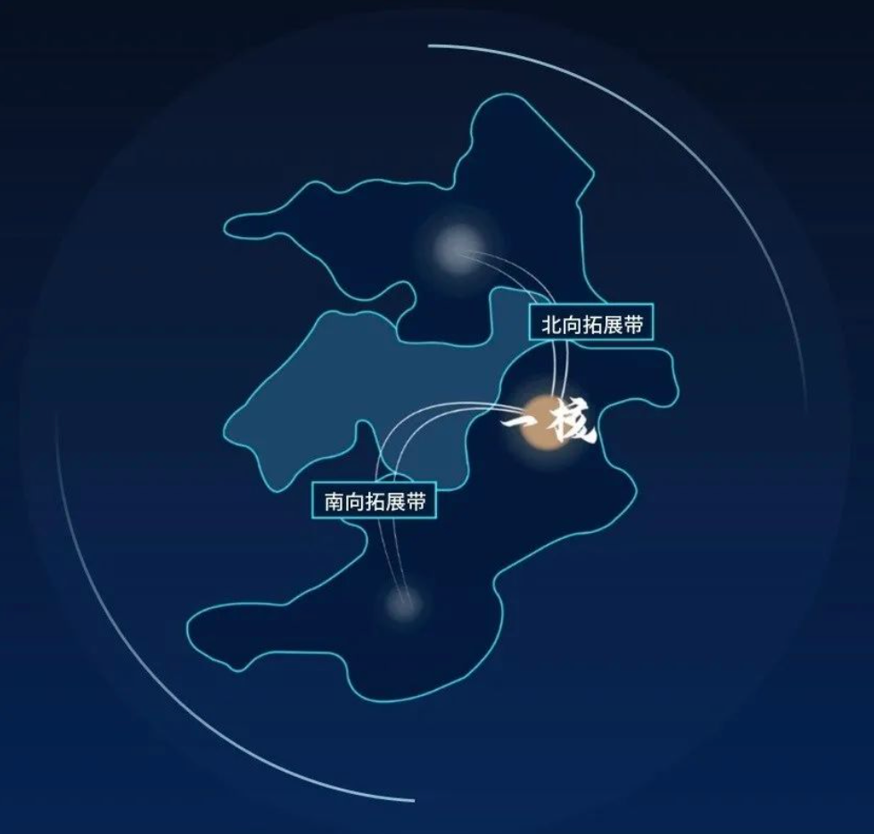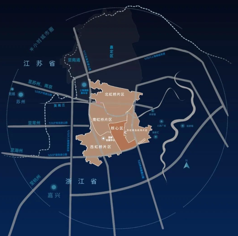 “1”和“2”是指虹桥国际开放枢纽“一核两带”功能布局。“一核”是上海虹桥商务区,面积为151平方公里,主要承担国际化中央商务区、国际贸易中心新平台和综合交通枢纽等功能。“两带”是以虹桥商务区为起点延伸的北向拓展带和南向拓展带。北向拓展带包括虹桥-长宁-嘉定-昆山-太仓-相城-苏州工业园区(后四个区县在江苏境内),重点打造中央商务协作区、国际贸易协同发展区、综合交通枢纽功能拓展区;南向拓展带包括虹桥-闵行-松江-金山-平湖-南湖-海盐-海宁(后四个区县是在浙江境内),重点打造具有文化特色和旅游功能的国际商务区、数字贸易创新发展区、江海河空铁联运新平台。